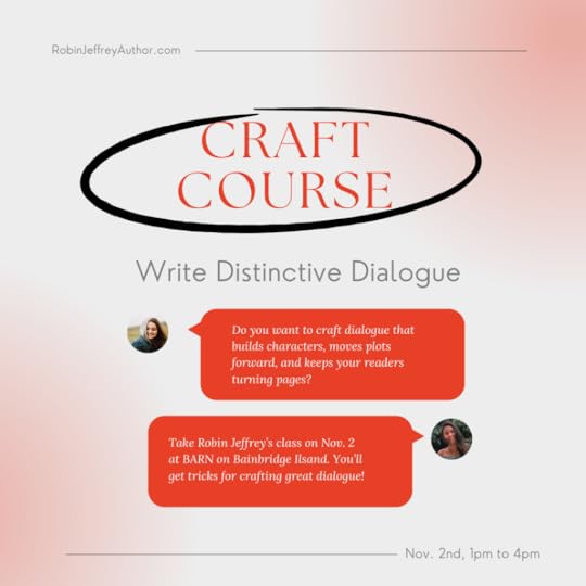If you’ve ever wanted to learn how to write dialogue that builds characters, moves plots forward, and keeps your readers turning pages I have got the class for you! On November 2nd, I will be the Bainbridge Artisan Resource Network (BARN) from 1pm to 4pm teaching a course on dialogue. Sign up to learn all the in’s and out’s!