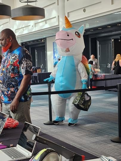 In our hotel room, I read out bits of Deep Secret to my husband, who confirmed the uncanniness with which they echoed our experiences. Both cons featured floor-length robes, Batman costumes, and the occasional slinky dress. Some men sported long-enough locks, and some enough facial hair, to do a Merovingian king proud. Rupert registers “a towering papier-mâché and plastic alien” one night; on Sunday morning, a colossal blow-up unicorn startled my husband and me. We were riding the elevator downstairs to breakfast, pausing at floor after floor. Hotel guests packed the elevator like Star Wars fans at a Lucasfilm debut. Then, the elevator halted again. The doors opened on a bespectacled man, 40-something years old by my estimate, dressed as a blue-and-white unicorn. The costume billowed out around him; the golden horn towered multiple feet above his head. He gazed at our sardine can, and we gazed at him, without speaking. The elevator doors shut, and we continued toward breakfast.