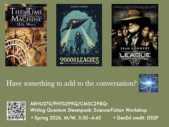 That conference will follow a quantum-steampunk creative-writing course to take place at UMD during spring 2026. I’ll co-teach the course with creative-writing instructor Edward Daschle. Students will study quantum thermodynamics, read published science-fiction stories, write quantum-steampunk stories, and critique each other’s writing. Five departments have cross-listed the course: physics, arts and humanities, computer science, chemistry, and mechanical engineering. If you’re a UMD student, you can sign up in a few weeks. Do so early; seats are limited! We welcome graduate students and undergrads, the latter of whom can earn a GSSP general-education credit.1 Through the course, the hub will spread quantum thermodynamics into Pullman’s world—into literature.