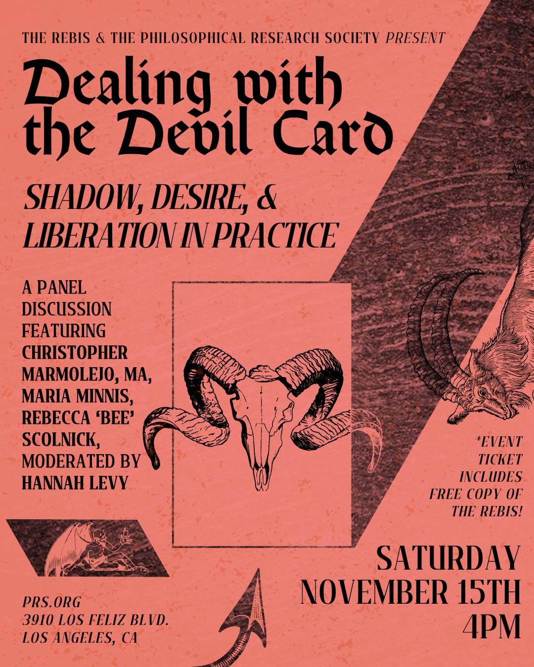 The Philosophical Research Society presents an intimate & vulnerable discussion with The Rebis : The Devil issue contributors about working with The Devil archetype in liberatory ways. The event will take place at PRS in Los Angeles, CA on November 15, 2025 at 4pm PST.