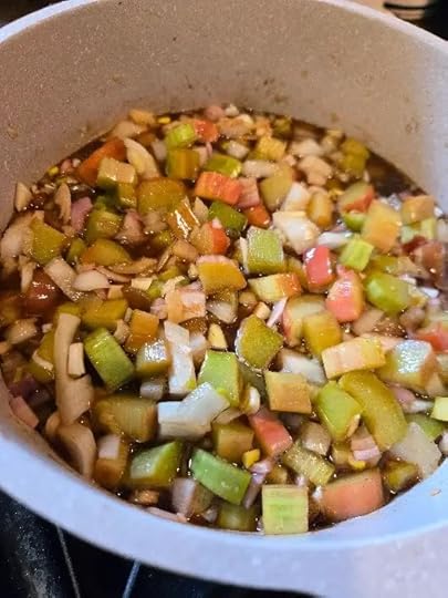 Combine all ingredients except 1 cup of the chopped rhubarb in a non-reactive pot- steer clear of your cast iron here too, as the acidity of the vinegar can mess with it.