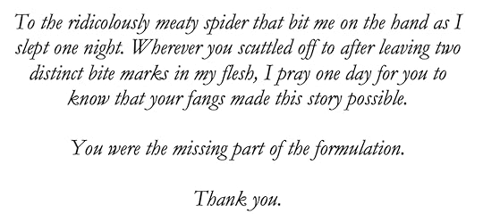 Whichever demon bit me while I peacefully slept injected me with the missing piece of my tale. Therefore, my first-ever foreword is dedicated to my eight-legged friend.