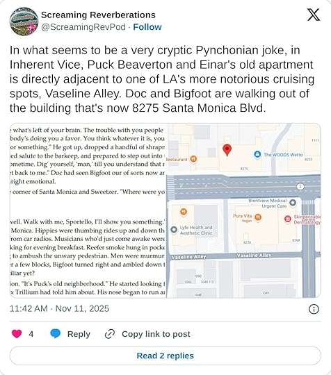 к тому же, здесь у Пинчона переброшен ещё один мостик к битникам (после “V.”) – через джаз 30х (саундтрек прекрасен, как и подбор напитков). а к концу пятой главы и вообще появляются знакомые персонажи из этой “идеальной вселенной Противоденствия”. и уже прямым текстом даны несколько ключей к пониманию его текстов “сложнее”, например, “Радуги тяготения”. русские шуточки опять удивительно уместны – до того, что возникает ощущение, будто книжка для каждого читателя открывается своя, особая, что никто не читает одну и ту же книжку, а это, как известно, один из признаков гениальности Пинчона, пусть даже он пишет самую лёгкую и развлекательную хряпу. хотя и здесь не без загадок, конечно: например, куда делась сцена в Триесте примерно посередке романа – она там явно должна быть (ответ: видимо, туда же, куда и пара сотен страниц, заявленных в начале). ну и в расцвете разнообразных оттенков национализма (преимущественно, конечно, бурого), конечно, нельзя не увидеть день сегодняшний.