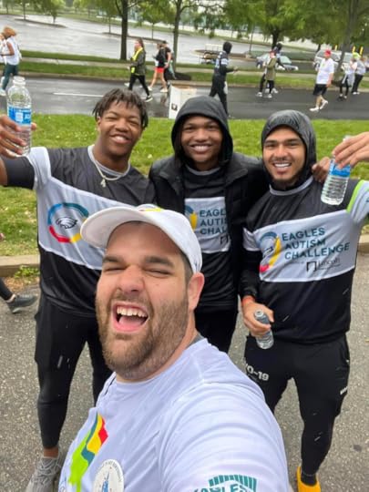 Ben participated in his 6th Eagles Autism Challenge this summer. The new Eagles rookies always pass out water along the 5K route and they asked if they could douse Ben with water, all in good fun, when he stopped. Ben didn't mind at all since he was already soaked from the misting rain during the event. What a great group of guys!