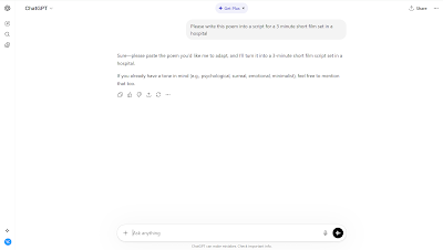 I like ChatGPT for script conversion for stories or poems because it doesn't add too much extra stuff, and you can tell ChatGPT what length script you want, with additional prompts. Here, I told ChatGPT, "please write this poem into a script for a 3-minute short film set in a hospital."