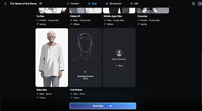 This is my final cast. See if you can fix mistakes before the next step. I didn't notice my nurse is wearing slippers and had to fix those slippers in every scene later on. Clicking next step is a big deal because it costs credits.