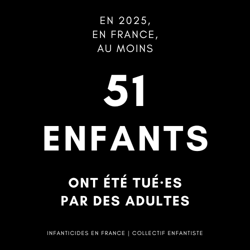 Au moins 51 enfants ont été tué·es par des adultes en France au cours de l’année 2025, d’après notre décompte Infanticides en France, tiré des articles de presse publiés sur internet.