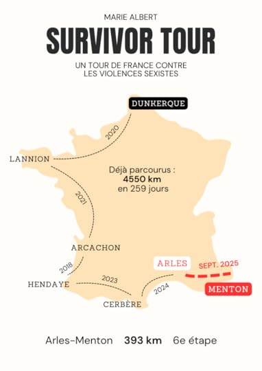 La sixième étape se déroulera 1er au 30 septembre 2025Aventurière féministe, j’ai entrepris en 2020 un Tour de France continentale à pied, soit environ 10 000 kilomètres de marche en solitaire. Je suis partie de Dunkerque (Nord) le 1er juillet 2020 en appelant cette aventure le « Survivor Tour », soit le Tour de France d’une survivante.