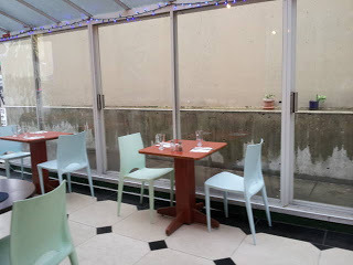 We ate in the pouring rain on this little patio to one side of the main room - warm and dry while the water ran down the windows beside us. Between us, we had many of the things on the menu, starting with humus and a terrific eggplant dip (aka mutabal), scooped up into warm soft pita bread. I could have quit right there, but I didn't. We added tabbuleh, which arrived with crisp lettuce leaves, so we could eat the tabbuleh wrapped in the leaves. Still didn't stop there.