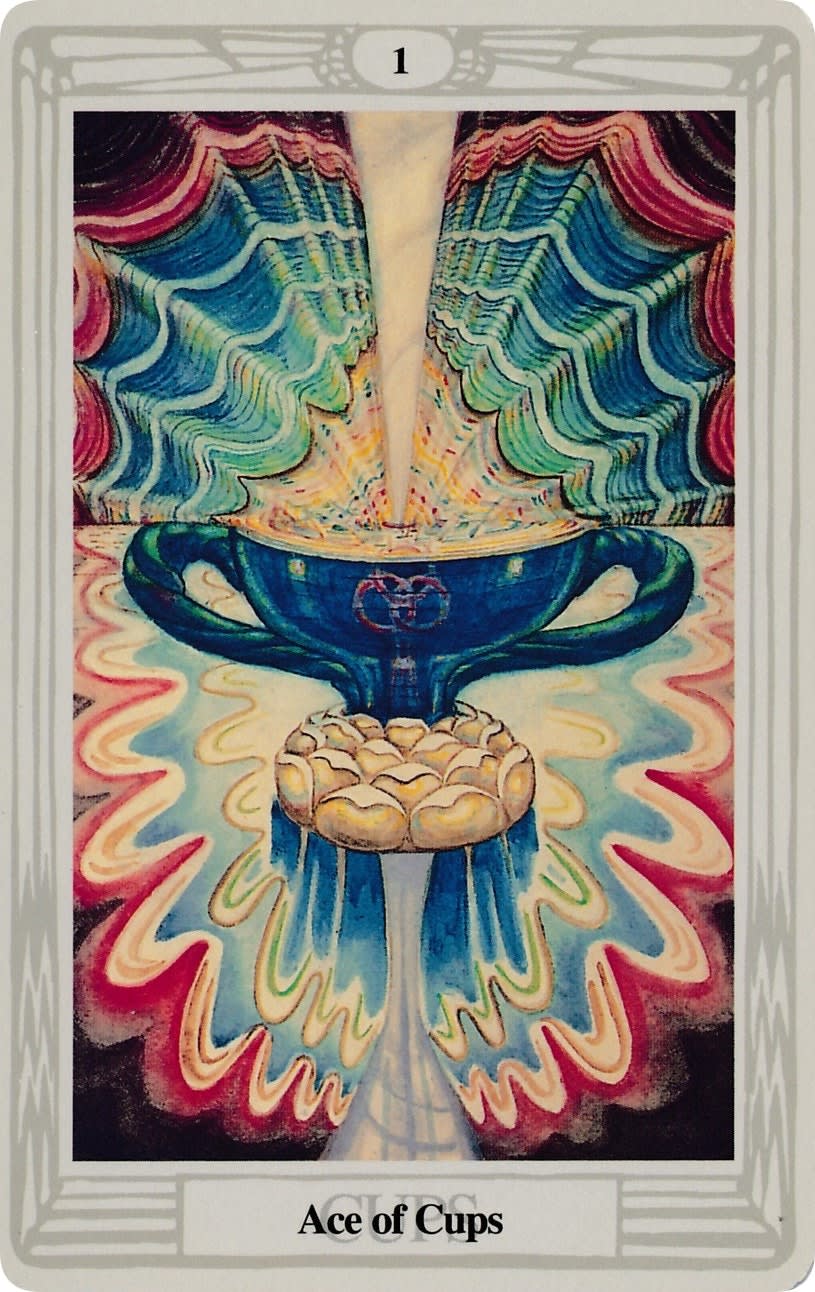 In Thelema, this ATU is no simple promise of romance. It is the root of Water itself, the primordial Grail, the feminine complement to the Ace of Wands, derived from the lunar yoni just as its fiery sibling is from the solar lingam. Crowley writes that upon the dark sea of Binah the Great Mother, there rise twin Lotuses that fill the Cup with Life-fluid, a current that may manifest as water, as wine, or as blood according to the work at hand. Above the cup descends the Dove of the Holy Spirit, consecrating the element. At the base gleams the Moon, for it is the virtue of this card to conceive and to bring forth the second form of its nature.