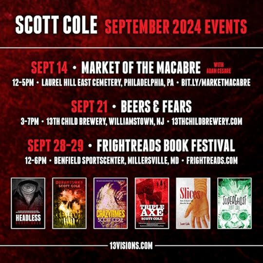 Scott Cole is the author of Crazytimes, Triple Axe, and SuperGhost, as well as two collections of short fiction, Departures and Slices. He is also an artist and graphic designer. He lives in Philadelphia. Find him on social media, behind you in the mirror, or at 13visions.com.