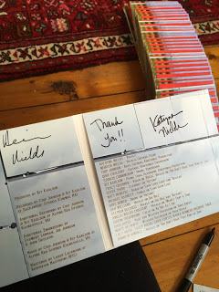 I put a CD into an envelope, sealed it, and looked at the address. Fans from Missouri. Fans from Texas. Fans from Florida. Several from Seattle. One from Wisconsin. Many from CT, NY, MD, VA. Too many to count from MA. I was overwhelmed with gratitude for these fans, some whose names I knew well; some whose names I’d never heard, though perhaps if I saw their faces I would recognize them. I saw names of friends, and names of cousins I rarely see. All four of my aunts pledged, and to see each of their names on our packages warmed me to the point where I almost felt like I could take off my balaklava. And in that cold living room, with Patty’s daughter and granddaughter (one helping, one charming) and Katryna, my kids (also helping, charming) I felt a solid completion, even though we didn’t get every label onto every envelope, and there are still boxes of CDs, a few books and bags scattered around.