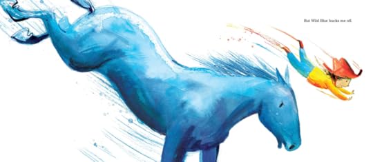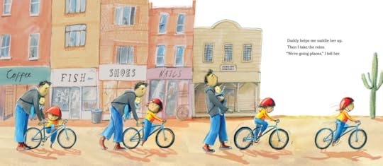 This picture book, in which a girl trades in her training wheels for a daunting two-wheeler, is a subtle but effective demonstration of how exposure therapy can conquer fear. . . . The acrylic-ink illustrations and sunset hues brilliantly enhance the Old West metaphor, as the landscape shifts incrementally from urban to rural. The ending, in which Kayla walks with, pats, sings songs to, and murmurs encouragement to Wild Blue, is a great example of step-by-step learning. — Booklist
