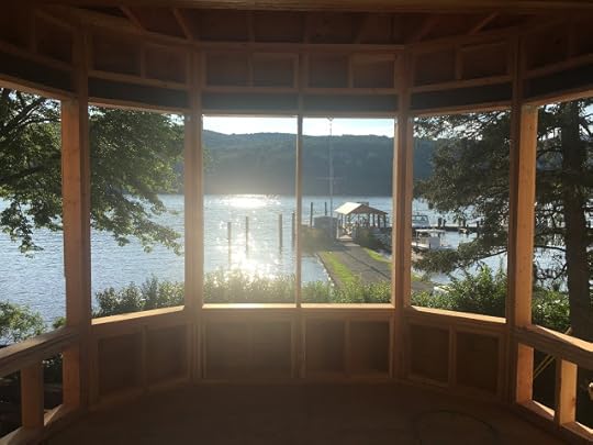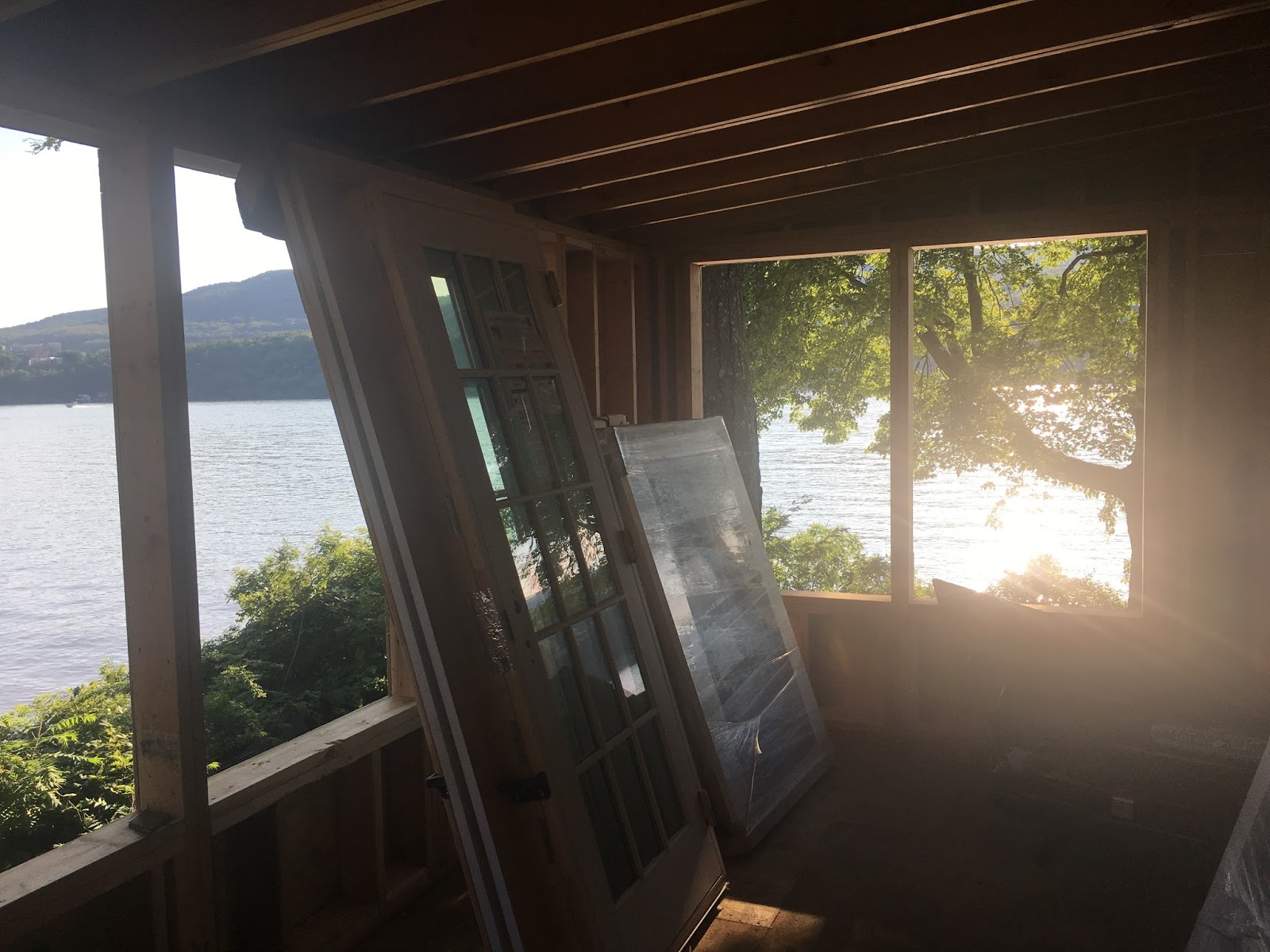 The nonprofit organization leading the reconstruction has rebuilt the pub area in back (no, the floor doesn’t slant anymore but that glorious view of the Hudson River is the same) and generally kept the building’s overall architectural shape in tact. The old green phone booth still stands outside (it might become a library book trading outpost, I’m told), the stone fireplace is there (couldn’t see if the gold shamrock was still embedded on the hearth as it was covered with new windows about to be installed.) The divide between the store and the living area is gone; the floor-plan is very open. The upper floor will have two apartments with loft spaces and views of the Hudson.