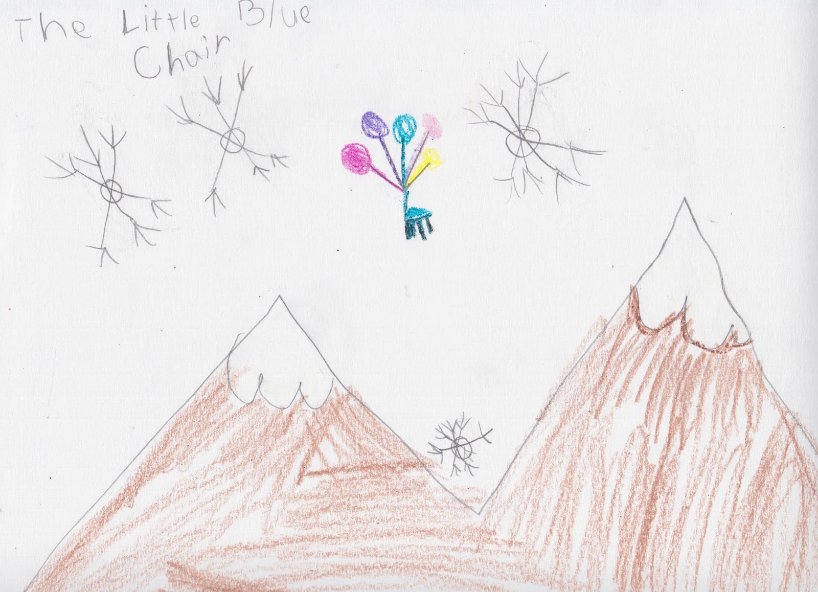 I had a wonderful time at the writers festivals this fall in Winnipeg, Calgary, Whistler, and Vancouver. It was a privilege to read with so many great authors (Dennis Lee, Steven Heighton, Nathan Englander, Kathleen Winter, Susin Nielsen, Any Jones, Kyo Maclear, Sidney Smith...) and visit so many great schools. I'm always impressed by the positive feeling in schools these days. This drawing was done by a student in Whistler, B.C., who imagined the little blue chair floating over the Whistler and Blackcomb mountains that loom over her school. Nicely done!