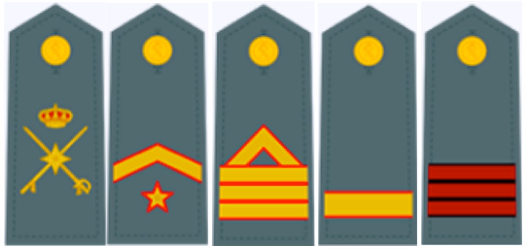 Las divisas van en orden jerárquico, no de enumeración. Y recogen las promociones que cada uno ha ido teniendo en este tiempo. Por cierto, una pista: en esta ocasión, para variar, todos ellos lucen sus galones en algún momento de la novela. Algunos, en muchos momentos...