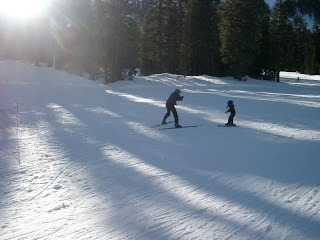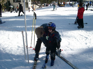And here's how we'd travel down the hill in those days. When I had to hike uphill to rescue him, it was (and still is) a lot easier when my heel is free. ("Free your heel, free your mind," we telemarkers like to say. "Half a binding,