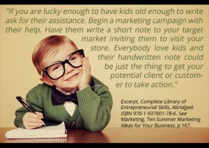 “If you are lucky enough to have kids old enough to write ask for their assistance. Begin a marketing campaign with their help. Have them write a short note to your target market inviting them to visit your store. Everybody love kids and their handwritten note could be just the thing to get your potential client or customer to take action.” Excerpt, Complete Library of Entrepreneurial Skills, Abridged. ISBN 978-1-937801-78-6. See Marketing, Ten Summer Marketing Ideas for Your Business, p 167.