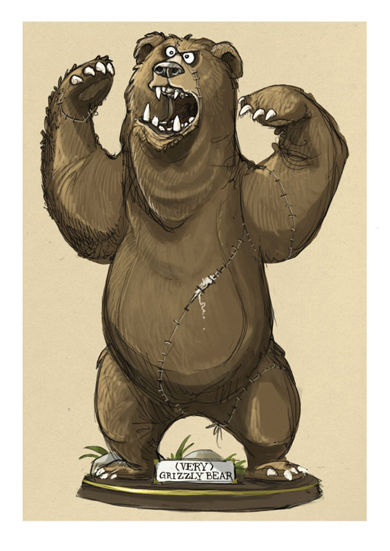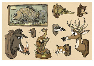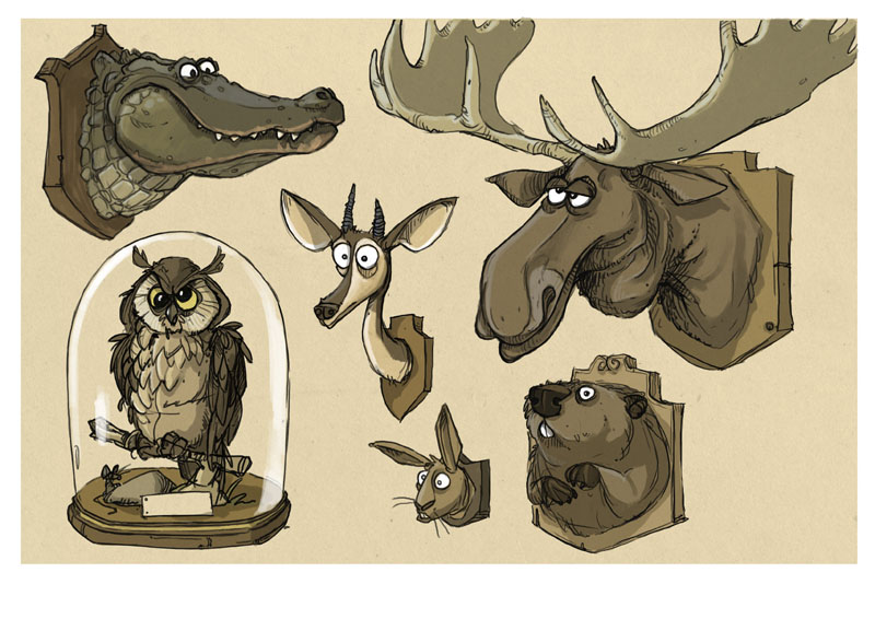 As well as character design, I spent quite a lot of time working in the set department, designing figurative elements in the backgrounds, from statues and figureheads to stuffed animal heads. This was really good fun!