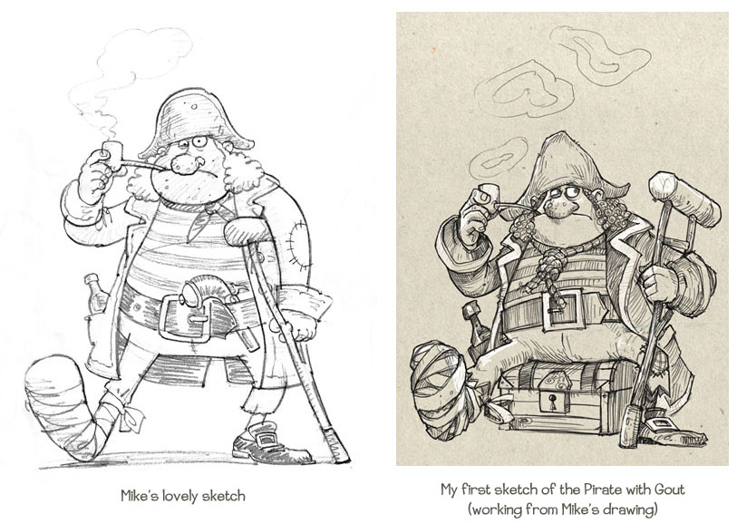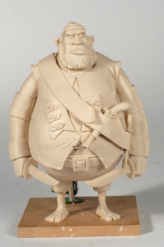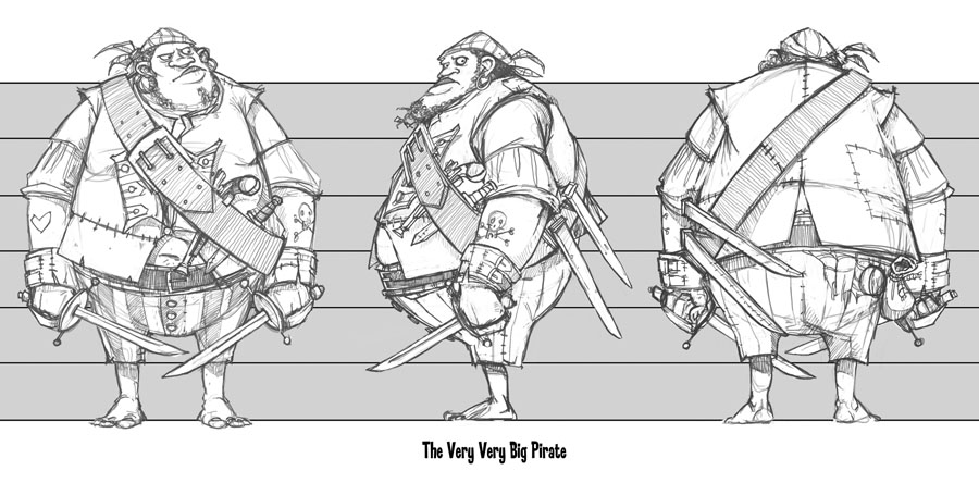 I started (on what was a very small team) in February 2008. I was having a tough time, following the death of my dad in a motorbike accident, and being asked to contribute to an Aardman project was a dream come true. My dad and I watched a lot of Aardman stuff a lot together, and both of us loved the humour, craftsmanship and attention to detail. I was shaking in my boots when I travelled down to Bristol to show the directors, Peter Lord and Jeff Newitt, my portfolio. The first thing I was asked to work on was a 'Very Big Pirate'. I think this was more of a test, to see whether my style would fit. This is the design I came up with...