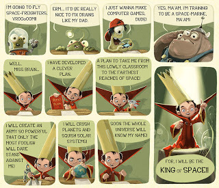 I last posted on 1st June!! That's rubbish!! Lazy me!! No real excuses, except I've been very busy. June and July were spent finishing off my next book 'The King of Space' (more to come later on that). Then I went on holiday with my family (and my Mum) to sunny Menorca, where I wrote a new picture book, whilst lying on the beach, in between being buried in the sand and paddling with my daughters. It's about dinosaurs (more to come later on that too). Then I had to catch up with some jobs that were a little bit late, because I'd spent too long finishing 'The King of Space'. Then I went to the Czech Republic to teach a week long course on 'character design for animation' for a fantastic event called Anomalia. Then I came home and sketched out the roughs for my new book about dinosaurs. Phew.
