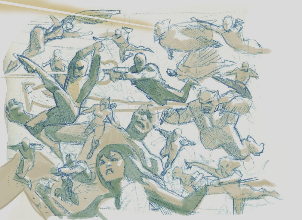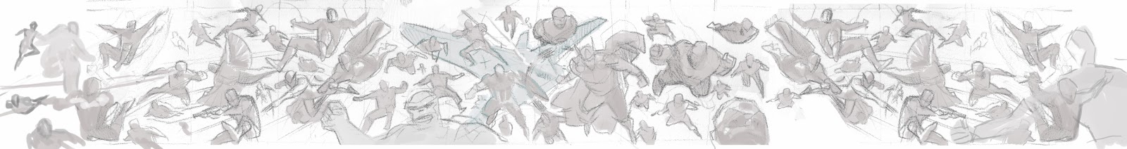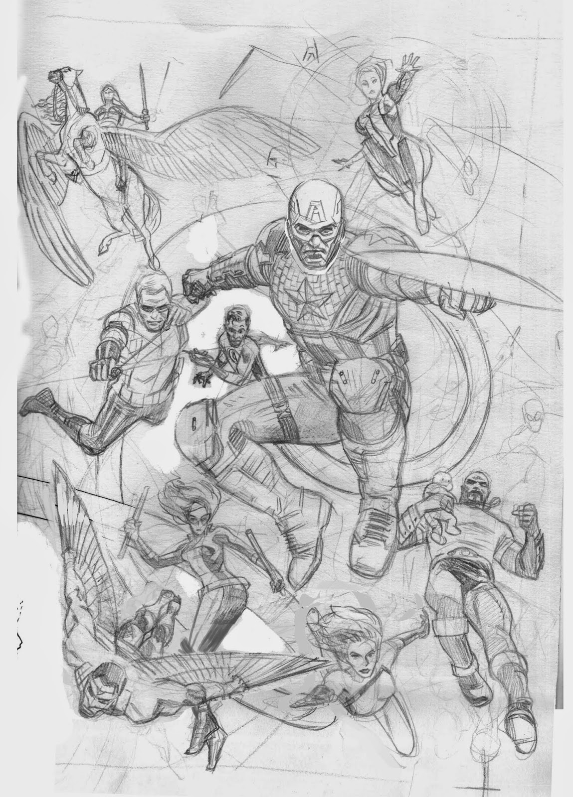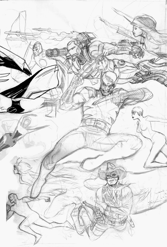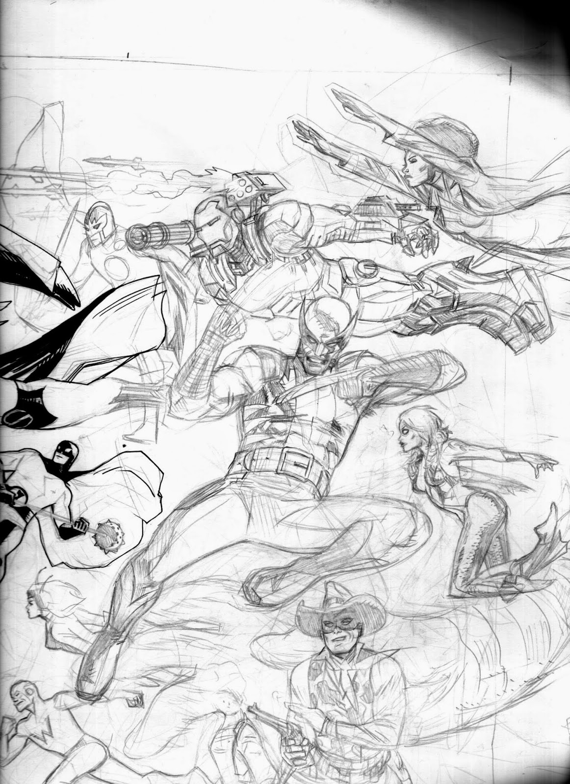El primer boceto que envié al editor para hacernos una idea del efecto final de como quedaría sin concretar los personajes escepto algunos que tenía claros como capitan, américa , thor , hulk ..lor originales , que tenían que salir juntos y yo tenía claro que irían en el centro ..