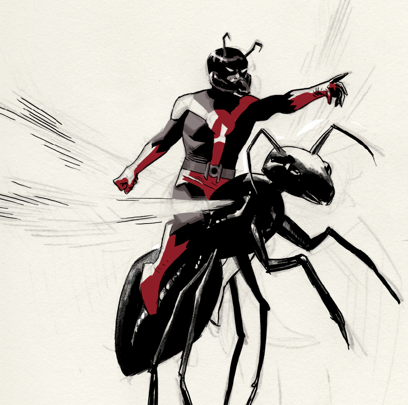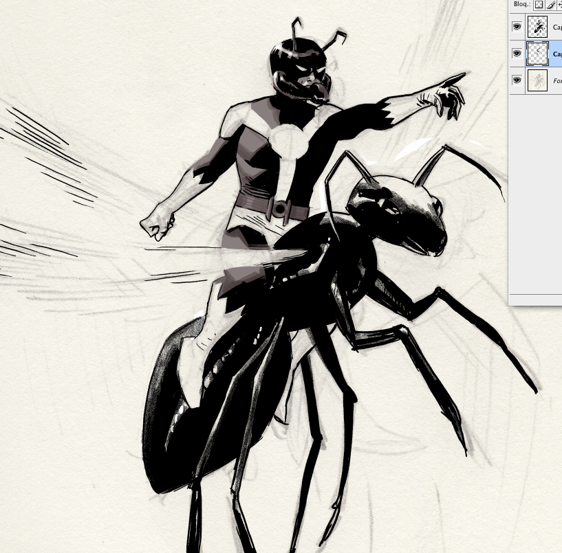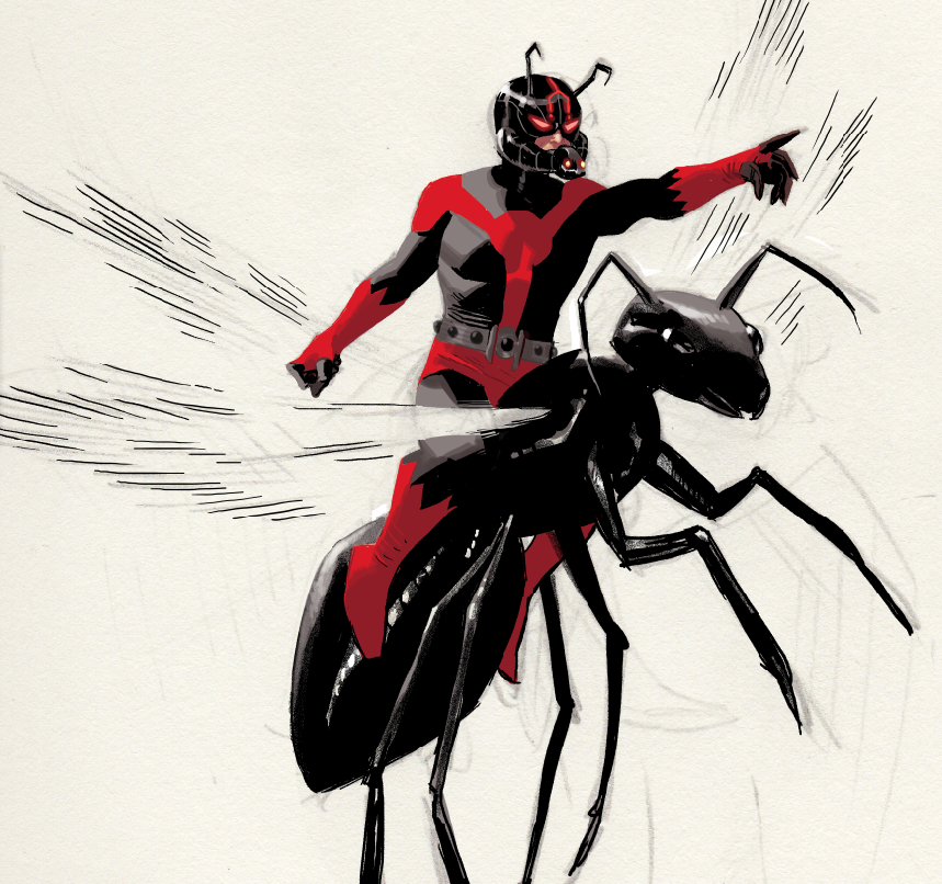 Proceso de trabajo de Antman para el poster de los Vengadores : Lápiz de toda la vida con tinta y color digital .El dibujarlo primero con línea me sirve para centrarme mejor en la figura con su estructura , sus sombras y volúmenes . Así , aunque el acabado es así como pictórico , sigo manteniendo un toque pop de colores planos .