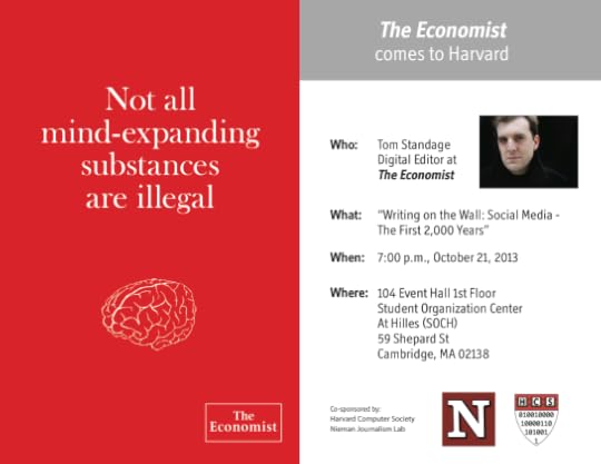 “Writing on the Wall: Social Media — The First 2,000 Years’ was published on October 10th in Britain and Commonwealth countries, and on October 15th in the United States. (To buy the book, click the links on the right.) I’m on the road promoting it for two weeks, starting in Seattle and ending up in New York. I talked about the book at Town Hall Seattle and at Powell’s in Portland, and next week I’m speaking at Harvard (see above) at 7pm on October 21st and at Barnes & Noble Tribeca at 6pm on October 23rd. But mostly I’ve been doing radio interviews (and some TV) and visiting tech firms, including Twitter, Facebook and Google, to spread the word that what they are doing is not as new as they might think. To be fair, Dick Costolo of Twitter, who I saw while at Twitter HQ, has compared Twitter with the agora or marketplace of ancient Greek city-states, so he’s been thinking along similar lines. So far the book has been reviewed by publications including the Guardian, Wall Street Journal, Independent, Financial Times and Literary Review. Having started work on this book in late 2010, I’m thrilled that it’s finally available on bookshelves, both physical and digital, and that people seem to be enjoying it — and agreeing with my contention that, as the Wall Street Journal puts it, “what we tend to regard as the radiant novelty of the digital age may really be a rebirth”.