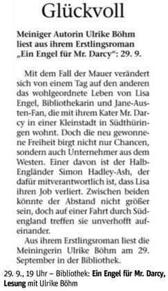 Das "Meininger Tageblatt" hat in seinem Kulturkalender meine Lesung Ende September angekündigt. Überhaupt habe ich im September etliche Lesungen - es wird ein interessanter Monat werden...