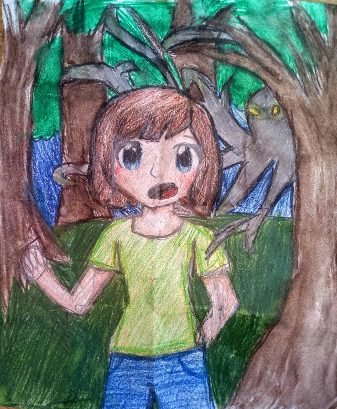 Firstly, this drawing, inspired by the front covers of my books Doorway To Danger and The Ghost Lord Returns. I LOVE the colouring and shading, the expression on the main character, Becky's, face and the creepy ghost lurking in the background.