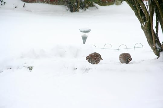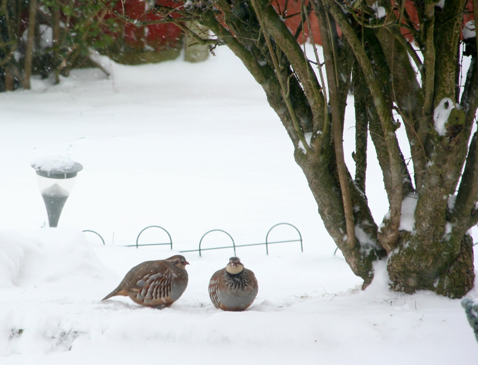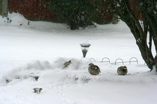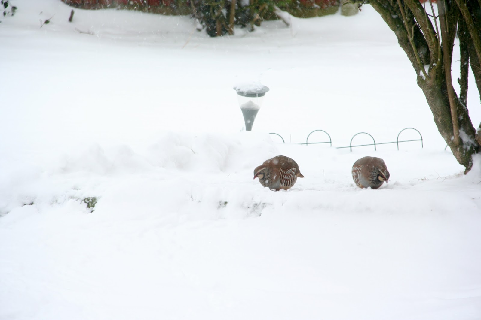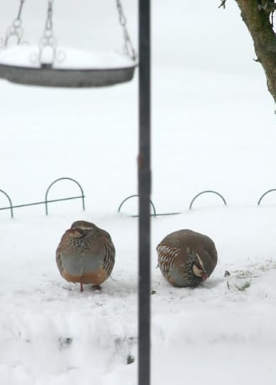 And here are a pair of red-legged partridges pecking through the snow in my garden this morning (click on the images to see them full screen):