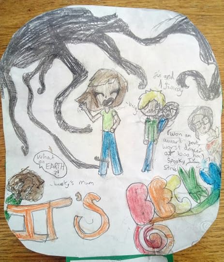Secondly, this drawing, which creatively brings together ideas from my school visit and things they found out on YouTube. I love Becky's mum screaming 'What on EARTH?!' in the left hand corner, and Spooky Steve (winner of the worst dancer at Boo Hoo TV) on the right. I also love the expressions on Becky, Finn and Jimmy's faces as they are being attacked by a spectre.
