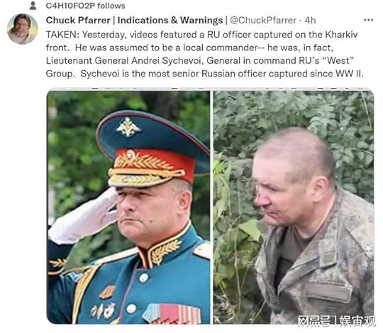 0共享至用微信扫码二维码共享至老友和朋友圈此前被乌克兰捉住的中校身份确认了!系俄罗斯西部集团军指挥Andrei Sychevoi中将。系自二战以来,俄罗斯被俘榜首流将校。9月6日,乌克兰特种突击队,在渗透到俄军后方的时分,埋伏了一辆俄军越野车。车上一名俄军中校和司机被乌克兰特种兵打了闷棍,俄军中校和司机都被乌克兰特种兵俘虏。乌军捉住的这个扭头不看镜头的中校,便是俄军西方进犯群的指挥官安德烈·西切瓦中将(Андрей Сычевой)。他换上中校制服并企图逃脱而无法识别出其身份。由此可见,当地俄军对乌军已推进到那里彻底不知情。俄罗斯戎行在从巴拉克利亚匆促撤离时再次留下了一切的配备物资。乃至没有来得及毁掉它们。看来俄罗斯是铁了心要牢牢占住军事援助乌克兰国家排名榜首的宝座。特别声明:以上内容(如有图片或视频亦包含在内)为自媒体渠道“网易号”用户上传并发布,本渠道仅供给信息存储服务。Notice: The content above (including the pictures and videos if any) is uploaded and posted by a user of NetEase Hao, which is a social media platform and only provides information storage services.\n\n\n\n\n/阅览下一篇/回来网易主页下载网易新闻客户端