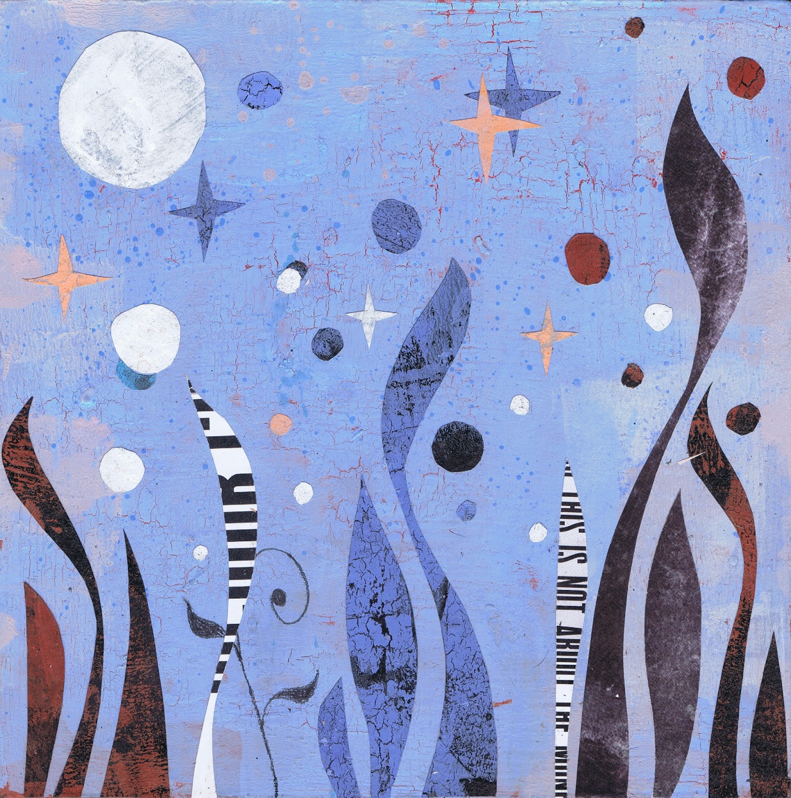 By the time I illustrated Lullaby , I wanted to take a different approach to these elements and began including magazine collage along with my hand-painted collage papers and the foliage took on a greater prominence.