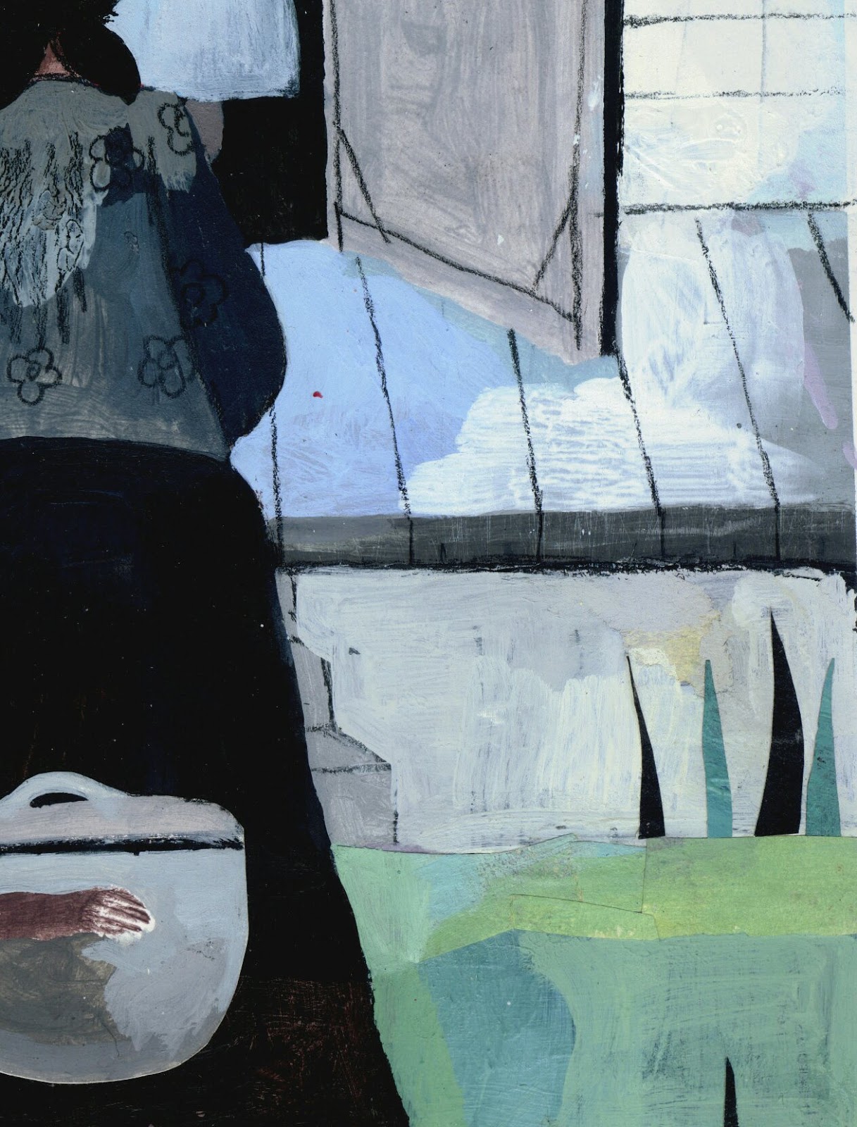 The Baby on the Way, I was required to alternate between scenes of the rural south and an urban rooftop garden. This was back in 2004 when I first began using hand-painted paper as collage for grass and other foliage.