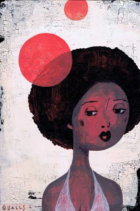 At each stage, I enjoyed changing the configuration of her facial features as each micro-movement gradually changed her appearance. Much more than AFRO 74, this piece evolved quickly. I believe I was driven forward by the knowledge of what did not work in it’s smaller, sister version above. Her gaze is meant to evoke the moment when one unexpectedly catches a glimpse of their reflection in a mirror, caught in between thoughts; a universal, perhaps soul catching moment. My hope is to have viewers see themselves in the painting even if they are of different gender, age, race or complexion. Also, working at this size allowed me to experiment with collage in the details of her eyes and mouth.