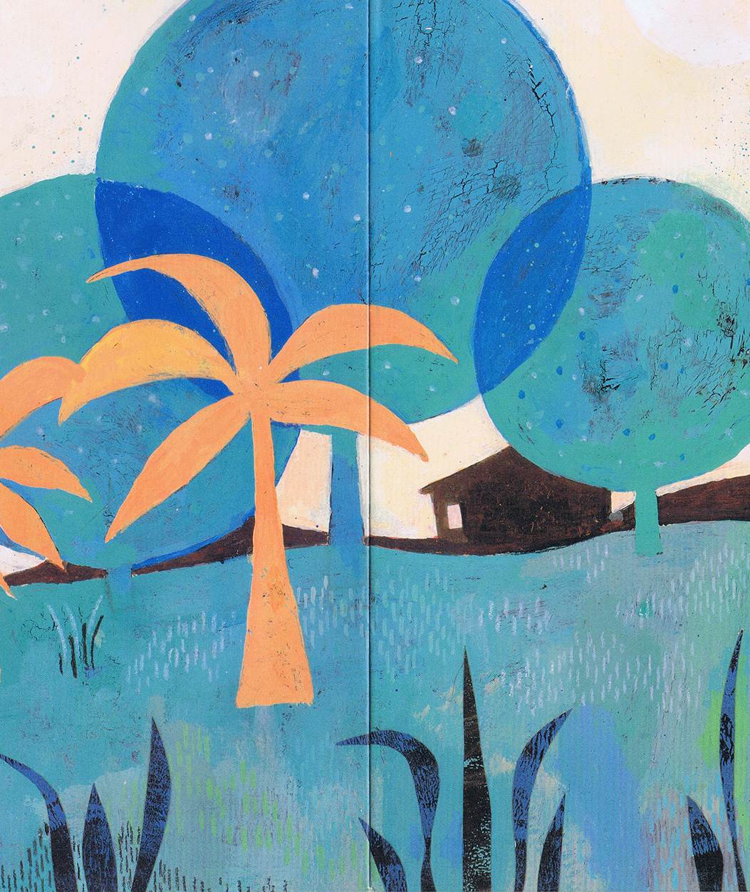 And with Emmanuel's Dream, I decided that a dialed back, hand-painted collage paper approach would work best to accent the landscape of Ghana.