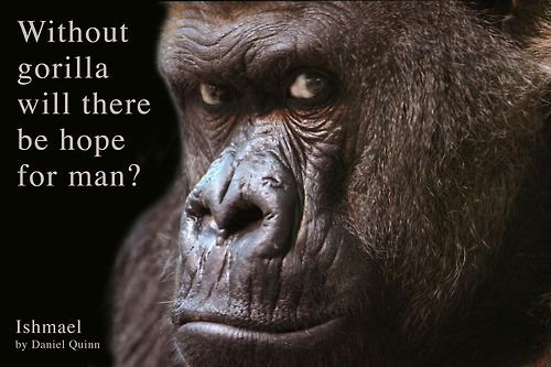 Daniel Quinn’s novel, Ishmael, is a conversation, start to end, between a gorilla and a man. If this strikes you as strange, it may be at first, until you set aside your disbelief and go along for the ride. And what a ride it is. A man is disillusioned with the world; he seeks something better, and that’s when he stumbles across an ad in the paper: “Teacher seeks pupil. Must have an earnest desire to save the world. Apply in person.” He applies, walks into a room, and comes face to face with his teacher: an intensely intelligent gorilla, Ishmael, who also likes to chew on stalks of grass and snuffle his nose.