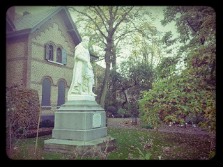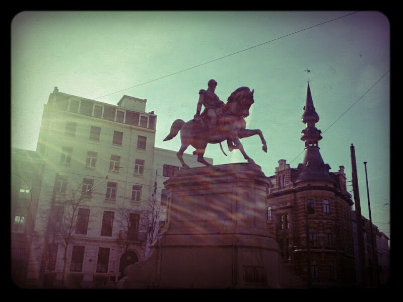 Ik nam de foto tegen de zon in en vind het resultaat best geslaagd. Her en der duiken zulke stambeelden op. Ik weet niet wie deze koene ruiter is, dat moet ik dan even opzoeken.Het paard doet me dan weer aan Bucefala denken en alle verhalen daarrond.