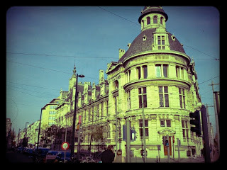 Het was een perfecte dag voor een stadsbezoek: prachtig weer en weinig volk. De foto's zijn een willekeur aan wat mij opviel. Ik weet bijvoorbeeld niet welk gebouw hieronder op de foto staat, maar ik vond de vorm ervan prachtig. Als je dan even je ogen sluit voor alles wat modern is, dan zie en hoor je zo de koetsen over de kasseien rollen, hoor je het geruis van lange rokken en het getik van wandelstokken van goedgeklede heren. Om de een of andere reden hoor ik er ook vioolmuziek bij, maar dat kan aan mijn radiokeuze liggen.