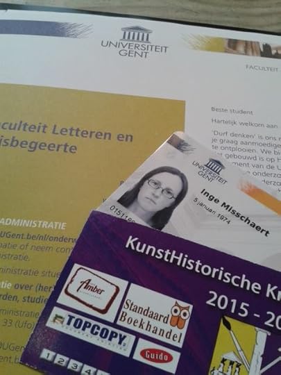 Ik bezit een kaart van de UGent (die mij geen kortingen oplevert, geen idee waar ze verder voor dient: uitzoeken dus.)Ik bezit een kaart van de Kunsthistorische kring, die mij WEL kortingen oplevert: driewerf hoera. De mevrouw van Standaard Boekhandel fronste wel even, maar kunsthistorisch gezien mag een student daar blijkbaar wel wat 'gedateerd' zijn - grijns. Stiekem schep ik er toch wel een beetje een sardonisch genoegen in om overal te vragen of ik korting krijg met mijn studentenkaart ...Ik was nog maar net ingeschreven, of ik zat al in de drek (om dat Engelse clichématige gemeengoedje wat te vermijden): een buis in de kelder van de Blandijn bleek gesprongen te zijn (nu al buizen? ;-). Dat leverde een vreemdsoortig gehuppel door waterachtige substanties (niet nader te omschrijven, eerlijk gezegd) naar een gezellig kelderoord alwaar drie studenten boekenverkoop hielden en waar ik een turf van 4 kilo kon kopen.Wetenswaardigheid: Studenten met opgerolde stukjes keukenrol in hun neus leveren een verfrissende aanblik op.Wetenswaardigheid: Het slot op de kast van de Kunsthistorische kring is wat roestig - blijkt moeilijk te openen (zelfs met wetenschap van de juiste code): al ligt dat ook weer kunsthistorisch in de lijn der verwachtingen. Great expectations!Een feit: de hersentraining die mij vanaf nu te wachten staat, zal mij toch voor minstens een aantal jaar vrijwaren van vroegtijdige dementie.Het tijdschrift van de kunsthistorische kring heeft N.A.A.K.T. als titel en is razend boeiend (op de paar taalkundige malheures na - tja - ik blijf natuurlijk ook een schoolfrik Nederlands ;-), beware!)Ik mag volgens de studentenkaart deelnemen aan cantussen - een mens moet grenzen blijven verleggen, dat heb ik altijd gevonden.De student achter mij (een jonge frisse knaap) wilde hoegenaamd GEEN studentenkaart en ik was geïntrigeerd: waarom? Het jongmens in kwestie keek er zelfs een beetje getormenteerd bij, als was het een oneerbare vraag. Eentje om over na te denken.Een oud-leerlinge (talig geschoold) kwam binnen gedarteld en riep spontaan (en een beetje verschrikt): 'Mevrouw Misschaert!' ... Daar ging mijn incognito cover en hopla: ik werd weer oude doos ;-)Buiten liep nog een oude doos rond: een zwerver met talloze zakjes, een kapsel dat niet echt uit de toon viel en een zeer duistere blik. Mij vielen vooral de lompen rond zijn schoenen op. Volgens kenners heet hij Zakman (alweer een dubieus gekozen naam) en er doen wilde verhalen de ronde. Ik ben dol op wilde verhalen en een geschiedenis achterhalen is ook kunsthistorisch, toch?