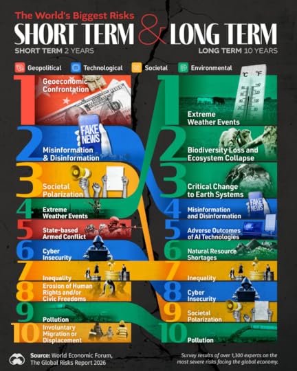 (Hieronder nog zo’n jaarlijke terugkerende grafiek. Het Global Risk Report van het wereld economisch forum. Laat ons hopen dat ze er helemaal naast zitten, want het ziet er niet goed uit.)