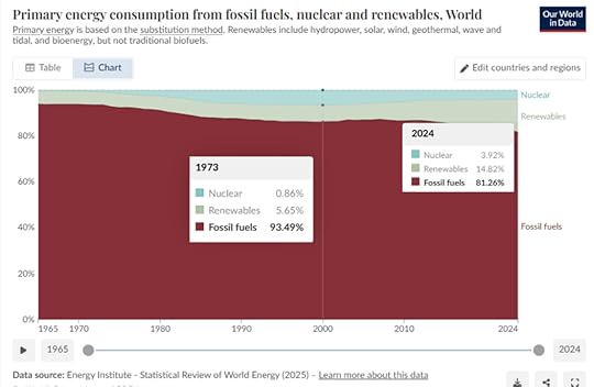 In 1973 was van alle primaire energie die de wereld gebruikte 93,5% afkomstig van olie, gas, steenkool of bruinkool. Het laatste beschikbare cijfer van 2024 geeft 81,3% aan. Dit is effectief een daling van 12,2% maar over een periode van 51 jaar! Aan dit tempo duurt het nog 340 jaar voor er we helemaal van af zijn. Natuurlijk is er de laatste jaren een exponentiële groei van hernieuwbare energie, maar die volstaat nauwelijks om de groeiende energievraag te volgen. Om het in andere woorden te stellen, in 1973 gebruikte de wereld 52.2 Twh (Terrawattuur) fossiel, in 2024 was dit 112.4 Twh. (alle cijfers komen uit Our World in Data) In percentage lijken we een heel kleine vooruitgang te boeken maar in effectief verbruik wordt het alleen maar erger.