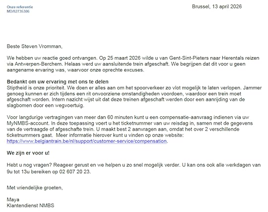 En dan is er nog de kwestie van de NMBS, waarvan ik op 25 maart een verslagje bracht. Een paar dagen terug kreeg ik twee mails! Eentje met volgende bijlage. (U moet dit niet helemaal lezen, het komt er op neer dat ik een terugbetaling moet aanvragen – wat ik al deed op 25 maart zelf). Maar goed nieuws; ze zijn er voor mij!