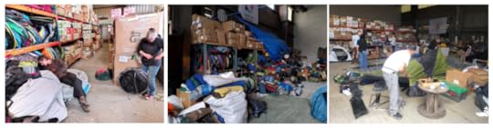 De eerste stop is de Loods van Mobile Refugee Support, een NGO die al jarenlang acties onderneemt in de regio. Met een internationale groep vrijwilligers verzamelt MRS hulpgoederen en brengt die elke dag naar het kamp. Elke keer als ik er kom wordt ik overweldigd door de hoeveelheid spullen die daar alsmaar binnenkomen. Niet enkel tweedehandsspullen maar ook nieuw gerief. Overtollige tenten van een hip festival, dozen en dozen met nieuwe handschoenen die uit de mode zijn, t-shirts en schoenen, te veel geproduceerde verbanddoosjes van een Japans automerk, slaapzakken en hygiënische producten. Alles wat uit de riool van de overconsumtie stroomt (en wellicht maar een fractie).