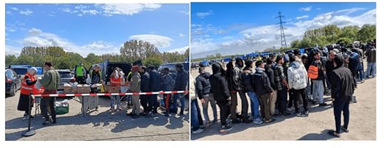 Het kamp is een open plek, zowat één kilometer van nog een symbool van de consumptiemaatschappij, een gigantische Auchan hypermarkt. Op het stoffige terrein staan tenten van hulporganisaties, een hele reeks toiletten, een vuilniscontainer en een waterkraan. Er is behoorlijk veel volk, en meteen na onze aankomst vormt zich een lange rij. Er zijn vandaag ook veel vrouwen en kinderen, voor wie we wat aparte spullen voorzien hebben. Tijdens het verdelen maak ik wat praatjes met mensen in de rij.