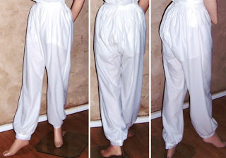 These trousers may be made in the wide Turkish style or a narrower width, from below-knee to ankle length. The leg ends may be enclosed in a cuff, confined with elastic, or left open at the bottom.