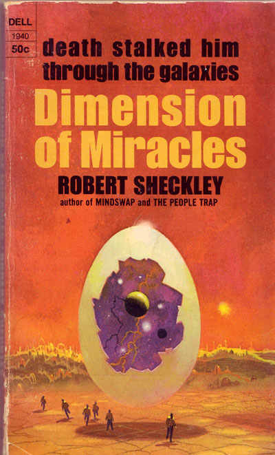 Dimensionof Miracles Below that, the author, some fellow named Robert Sheckley, who had also (according to the book cover, written Mindswap and The People Trap.Below that was a egg with planets and stars inside it, and tiny people on the ground below it. The cover was by Paul Lehr, and if you haven't seen at least a half dozen of his wonderful illustrations, you weren't reading SF in the 60's and 70's.