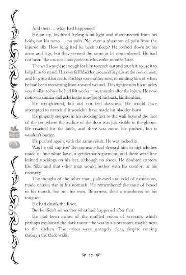 Also, the margins are not identical throughout the book. In the opening and closing pages, a more delicate scrollwork appears alongside a small illustration of a vial—the Root potion at the center of the story’s danger.