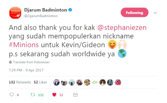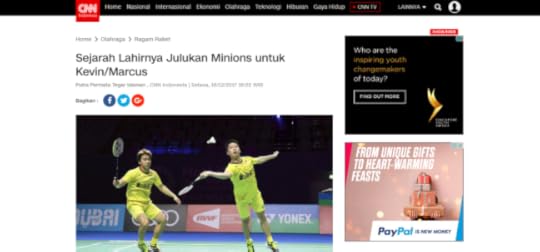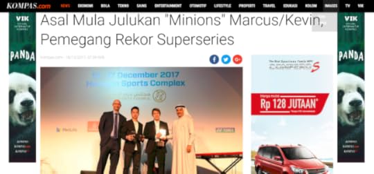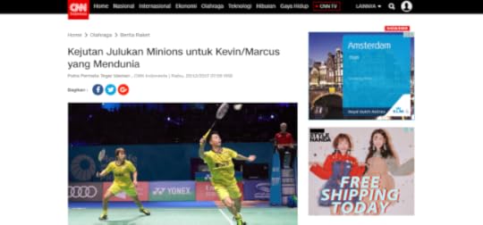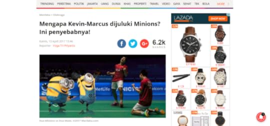 Gue yang pertama menjuluki mereka Minions, dan sekarang gue melihat julukan itu beredar di mana-mana. I still got a tingling feeling when I read the nickname at Kompas, when I heard it at Kevin/Gideon’s interview at Metro TV, but more than everything… I am happy Itu berarti, Kevin/Gideon bukan lagi Minions idola gue saja, tapi sekarang idola banyak orang.
